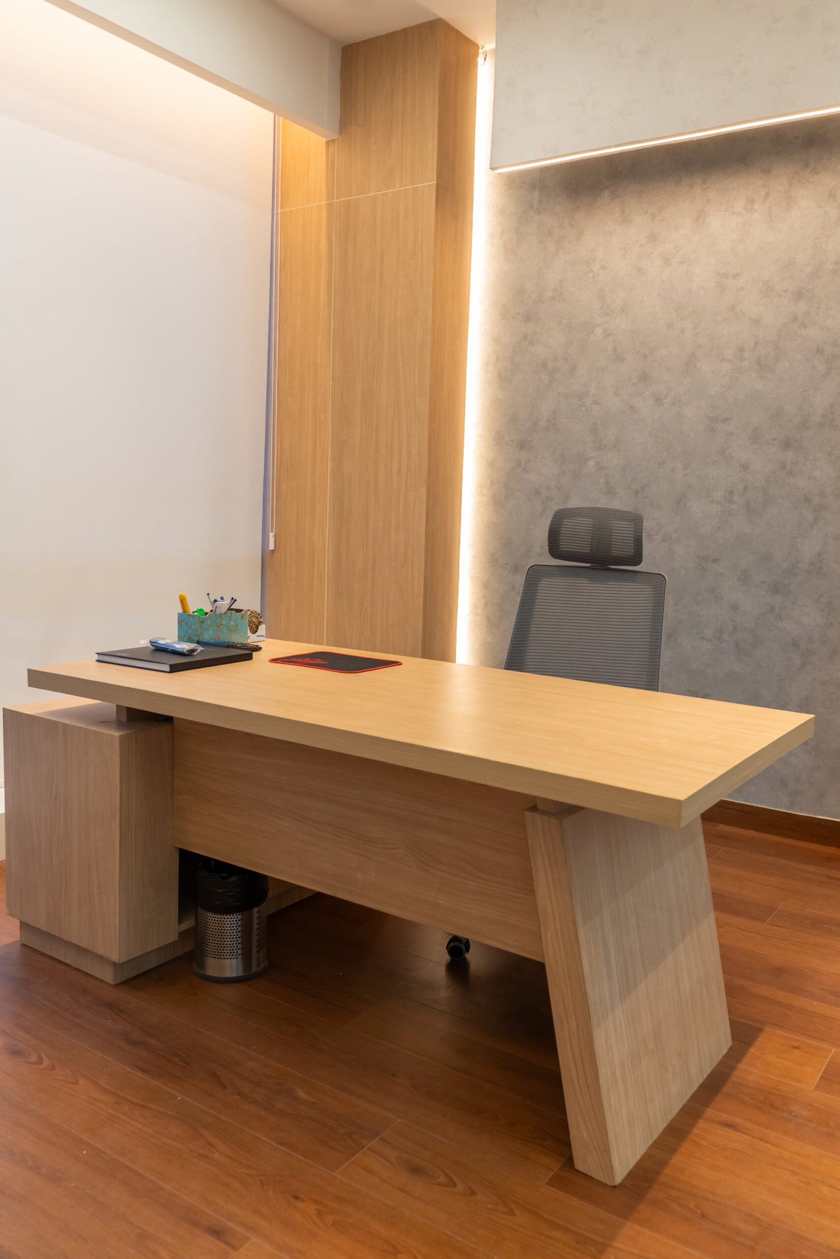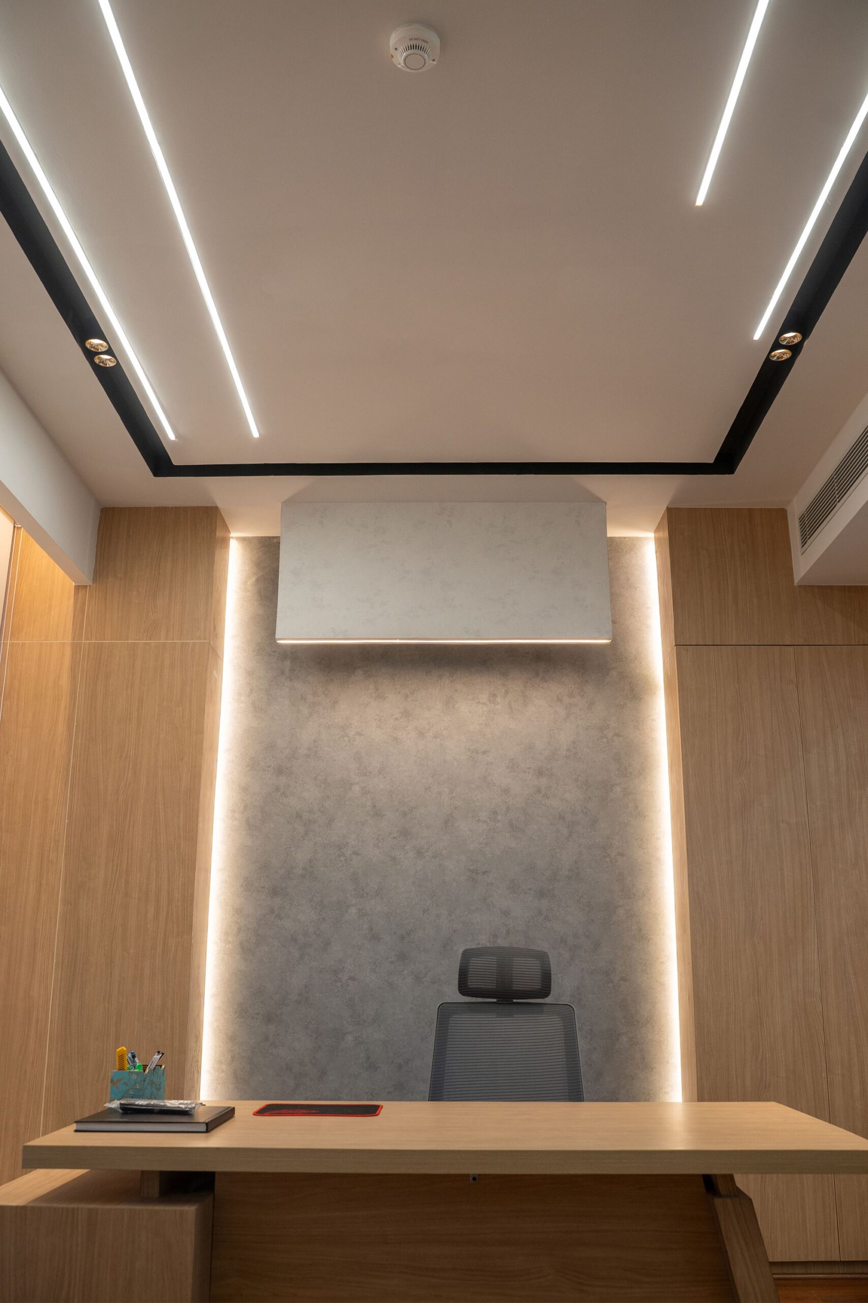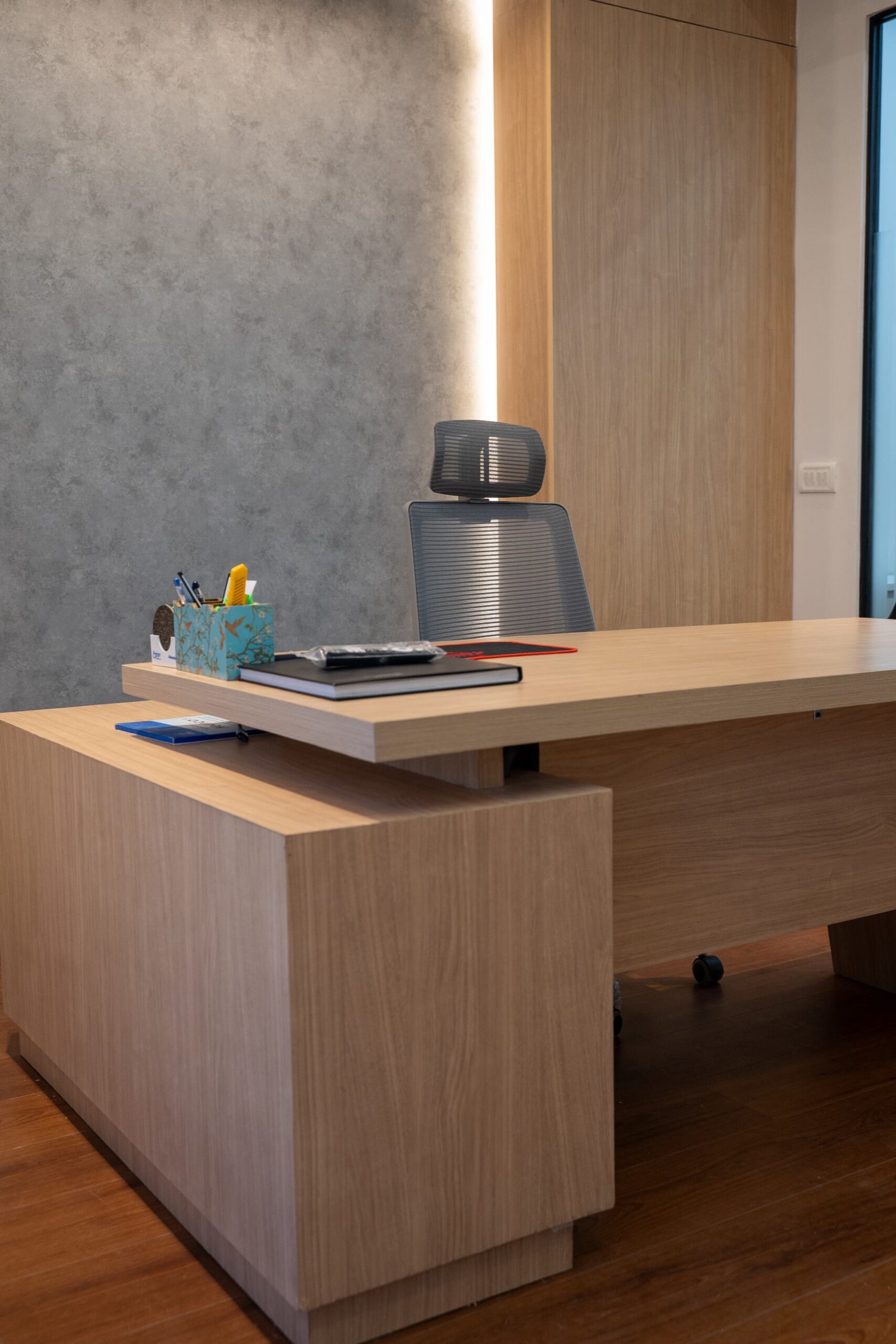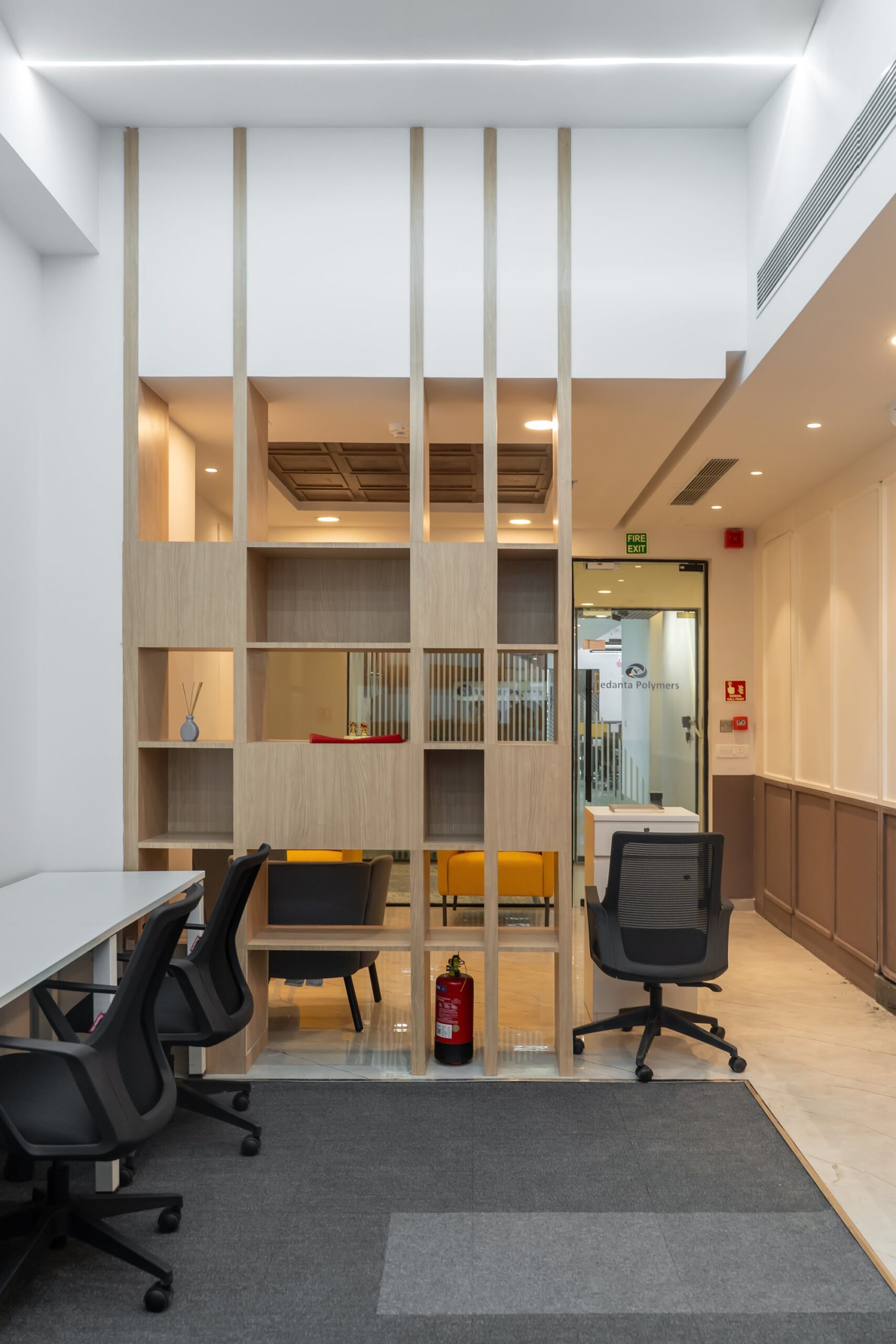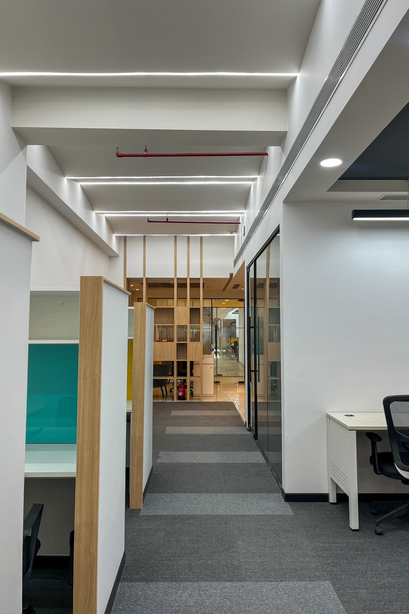 The office embodies a sleek, minimalistic design with a sophisticated neutral color palette and subtle accent tones. It features an array of desk types, from simple workstations to workstation cabins enhanced with semi-partitions, complemented by ergonomic chairs that blend seamlessly with the space. Modern, stylish lighting fixtures add a touch of elegance, while built-in shelving and personal lockers offer practical yet discreet storage solutions. The decor is refined, showcasing abstract art and lush, low-maintenance plants that bring a touch of nature indoors. Light-coloured laminate flooring and neutral carpet flooring complete the look, and ensure a serene and productive environment.